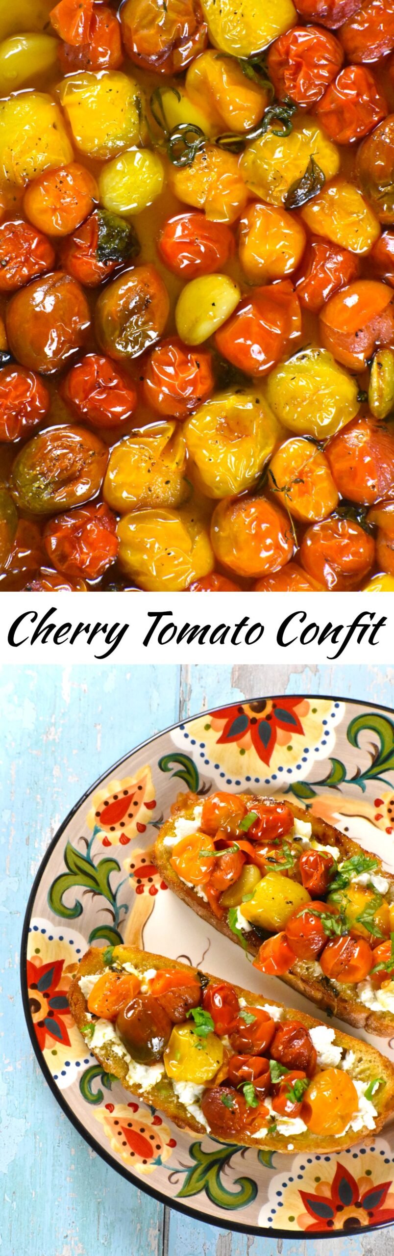 - 烤15分钟。把它拿出来搅拌,再烤5-10分钟。最后的时间取决于你的烤箱。当番茄变软,皮起皱,开始有些地方裂开时,油封就做好了。
