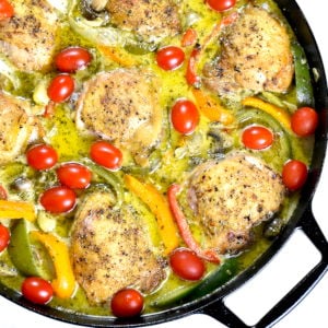 这奶油香蒜酱鸡肉煎锅是一个很棒的工作日晚餐食谱。它发生得非常快,快了30分钟!嫩鸡肉和大量蔬菜配上美味的奶油香蒜酱。YUM !