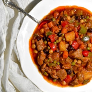 这道菜是用富含脂肪的猪肉在番茄酱中炖了很长一段时间,从而得到了浓郁的炖肉。它的香味被提升了一个档次,伴随着一些常见蔬菜的大量味道,以及不太常见的鹰嘴豆和葡萄干。但在这道美味的炖菜里,一切都完美无缺。让我来介绍我的新欢,我的朋友们,菲律宾风格!