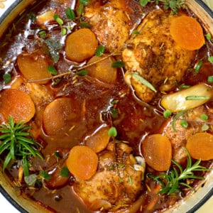 经典的炖鸡有三个主要的元素,在不同的阶段加入:当然是鸡肉,一些香料,比如大蒜和洋葱,还有汤汁。今天的箱子里是酒。我们还添加了一些很好的调味剂,比如新鲜的香草、蘑菇、番茄和杏。最后的结果是嫩滑的,骨头掉落,鸡肉浸在美味的酒酱中,红酒的酸味与杏的甜味相平衡。